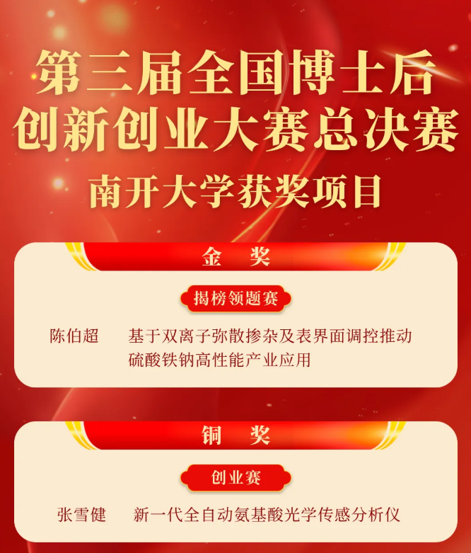 近日,第三届全国博士后创新创业大赛总决赛,在福建省泉州市落下帷幕。本次大赛以“博创引领四十载 智汇赋能向未来”为主题,设置创新赛、创业赛、海外境外(“一带一路”)赛、揭榜领题赛等4个组别。共吸引来自全国的46支代表队,8006个项目(方案),3.6万人参赛,规模创历史新高。经过激烈角逐,南开化学参赛团队成功斩获1项金奖、1项铜奖,取得历史性突破。用亮眼成绩单彰显南开化学勇攀高峰、科研报国的奋进之姿。